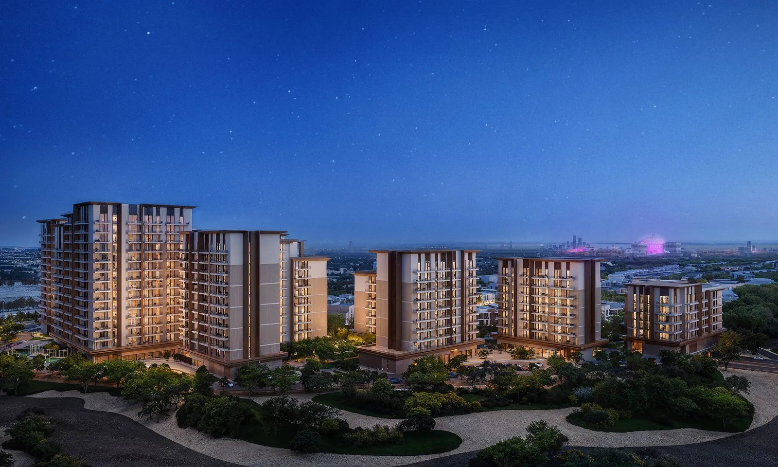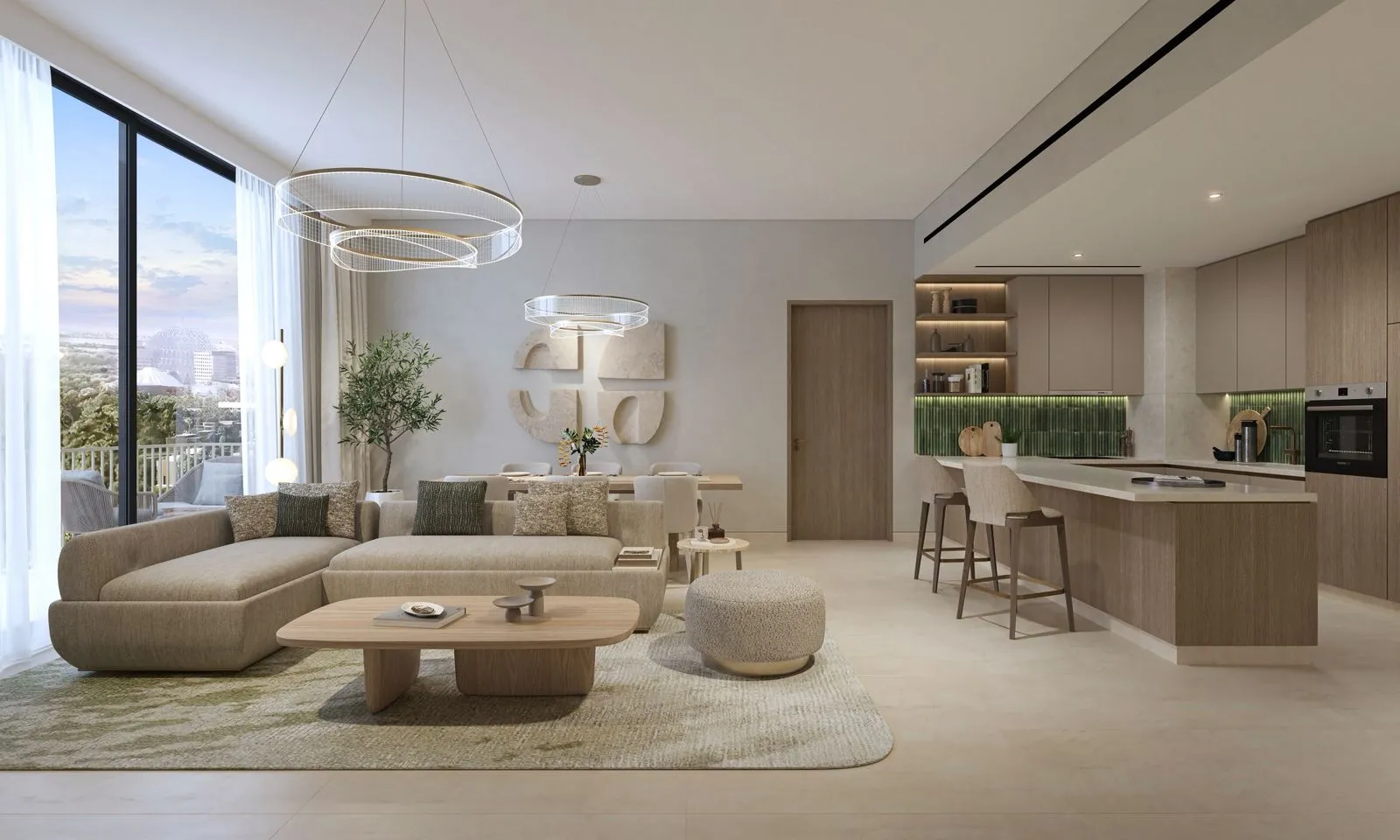 Expo Valley Views is a nature-inspired residential community set within the heart of Expo City Dubai, where architecture flows seamlessly with the landscape. The project embraces the natural contours of the land, with buildings rising softly from the earth and opening toward light, greenery, and expansive views. Calm, balance, and a connection to nature define the essence of this development, creating a living environment shaped by organic lines, soft tonal palettes, and serene outdoor spaces. Designed as a thoughtfully connected community, Expo Valley Views offers a collection of 1-, 2-, and 3-bedroom residences arranged across multiple floors. Private terraces overlook lush courtyards, shaded gardens, and the valley landscape, while generous layouts bring together openness, comfort, and modern living. Every residence is envisioned as a tranquil retreat, blending contemporary architecture with the quiet beauty of Expo City’s green surroundings. The community is enriched with a wide range of lifestyle and wellness amenities across the ground floor and podium levels. Residents can enjoy multiple swimming pools - including lap pools, infinity edges, and kids’ pools - along with main and satellite gyms, yoga areas, indoor kids’ clubs, prayer rooms, an indoor games room, multipurpose halls, BBQ areas, outdoor dining spaces, a community plaza, and landscaped event lawns. These spaces bring together wellness, recreation, social interaction, and relaxation in a harmonious, resort-like environment. Interior visuals throughout the brochure highlight soft natural tones, contemporary wood textures, warm neutrals, and clean architectural lines. Homes feature large windows that maximize natural light, creating bright, balanced living spaces. Two interior palettes - Timeless Elegance (contemporary, monochrome, refined) and Calm Canvas (softer, nature-inspired materials) -emphasize serenity and understated luxury. Kitchens are shown with modern fitted layouts and integrated cabinetry, while bedrooms include elegant wood paneling and warm lighting.
