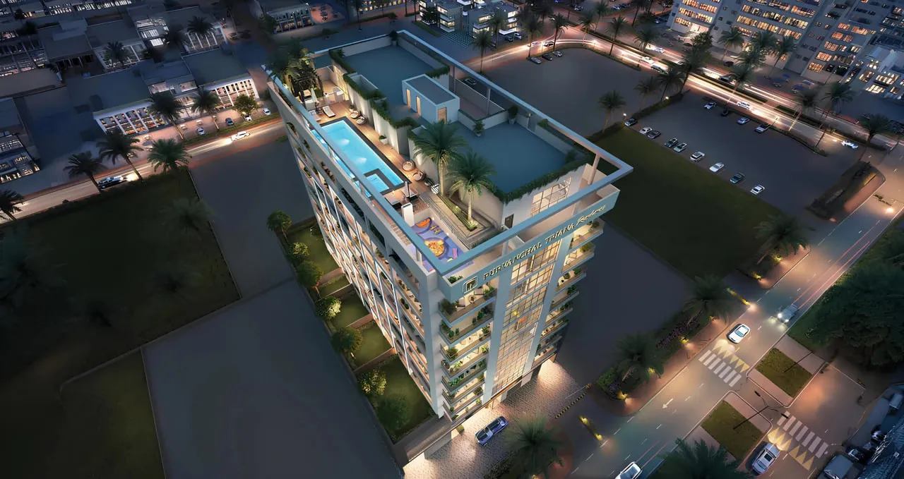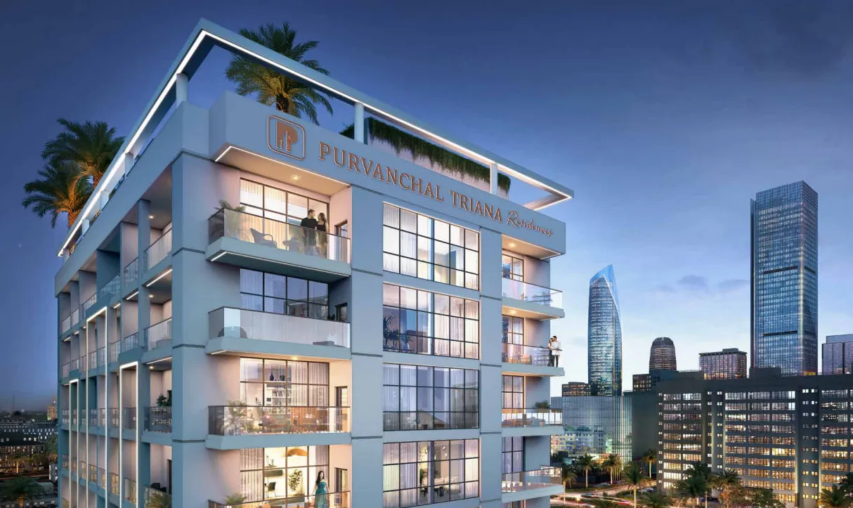 Triana Residences is a contemporary residential development by Purvanchal Development, situated in a prestigious urban district of Dubai. The building is designed with a clear vertical composition that includes podium levels, residential floors, and a rooftop, creating a well-balanced architectural profile. Its modern form reflects a commitment to quality living, combining functionality with refined aesthetics in a carefully planned residential environment. The exterior architecture is defined by clean, elegant lines, expansive balconies, and glass railings that enhance openness and natural light. Thoughtfully integrated landscaping introduces greenery throughout the development, softening the modern design and reinforcing the upscale character of the surroundings. The project offers a selection of residential layouts, including studios as well as one- and two-bedroom apartments, allowing for flexibility to suit different lifestyles and living preferences. Interior spaces are designed to feel bright, comfortable, and contemporary. Modern layouts are complemented by large windows and high-quality finishing materials that enhance both functionality and visual appeal. Kitchens are seamlessly integrated into the living areas, featuring modern cabinetry and practical layouts that support everyday use. Decorative elements and finishes are selected to create a calm, elegant atmosphere, allowing residents to personalize their homes while enjoying a cohesive design language throughout the residences.
