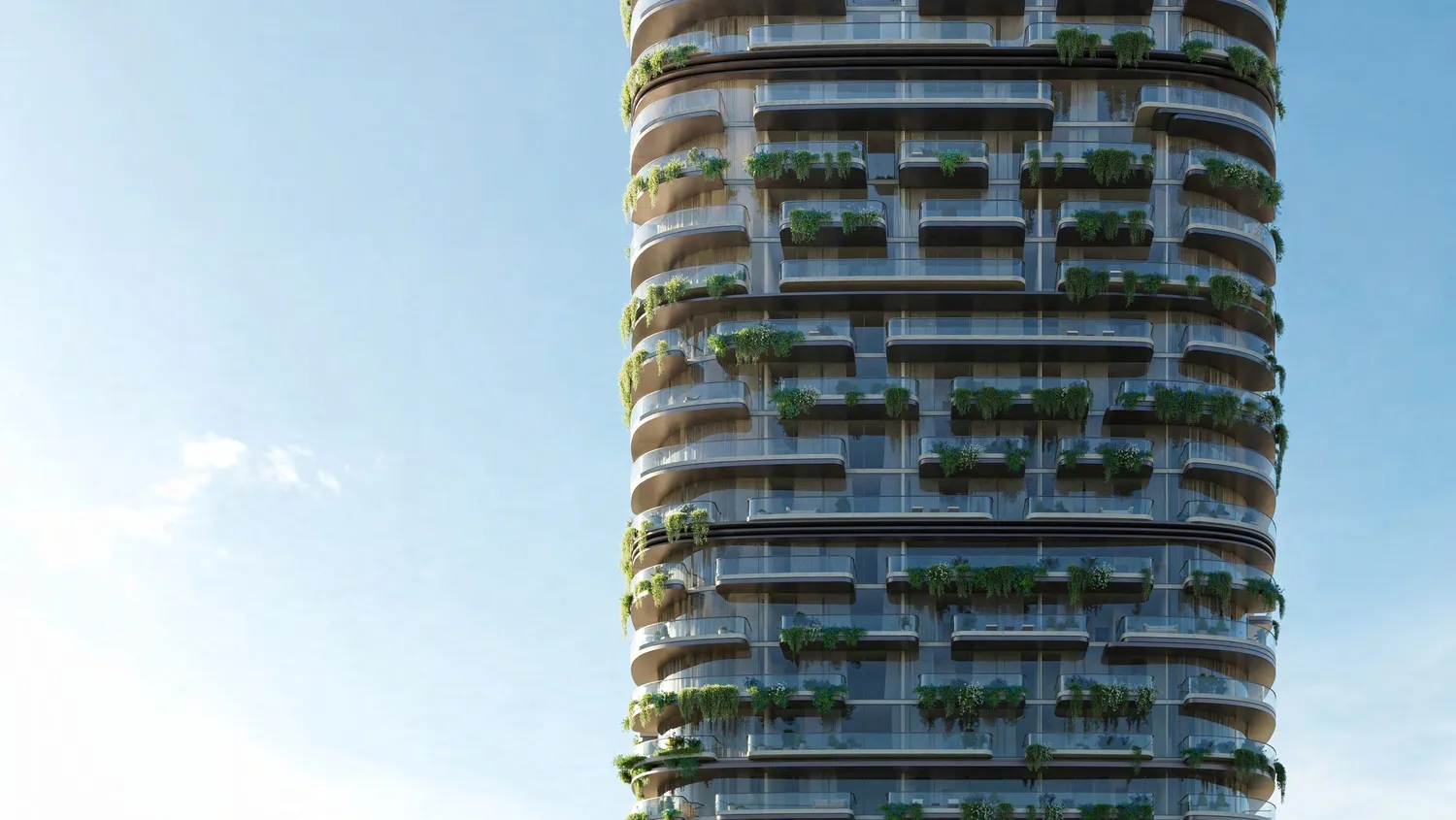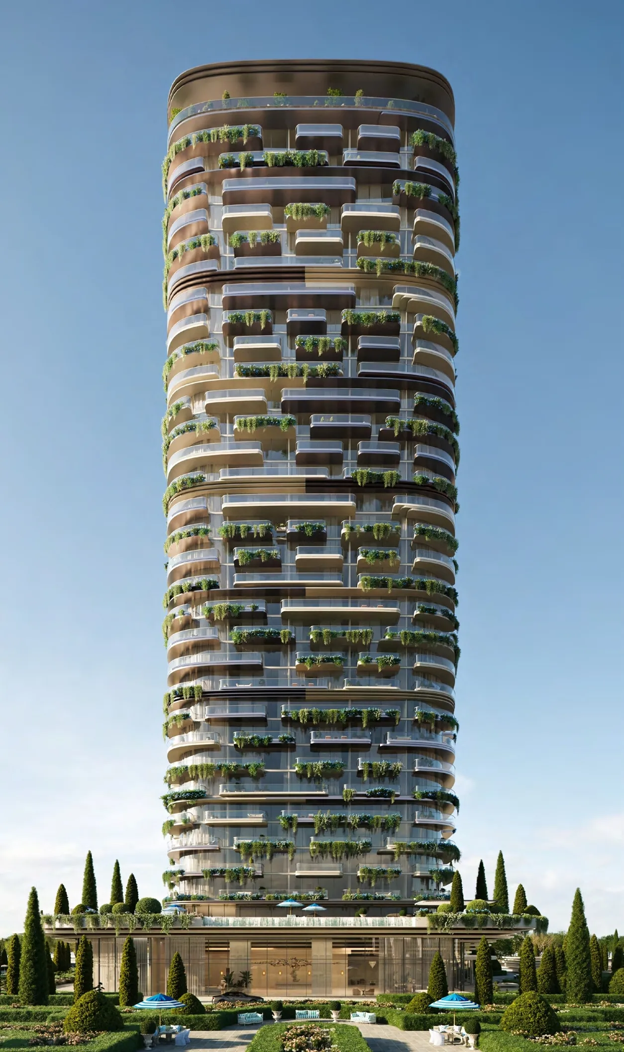 Le Château is conceived as a modern expression of grandeur inspired by the French philosophy of l’art de vivre. Set within Evermore, BEYOND’s fully masterplanned destination in Ras Al Khaimah, the project forms part of a curated coastal environment where architecture, landscape and lifestyle are envisioned as a cohesive whole. Rising in a sculptural spiral form across 31 floors and comprising 257 residences, the tower is defined by its flowing geometry, alternating white and bronze balconies, and integrated greenery that softens the façade and strengthens the connection to sea and sky. Light-filled one- to three-bedroom residences are shaped by rhythm, proportion and seamless indoor-outdoor flow. Facilities and amenities at Le Château are designed as an extension of everyday living rather than standalone additions. Landscaped gardens, sculpted courtyards and elevated terraces reinterpret classical French garden principles with contemporary restraint. An adults’ infinity pool with sparkling shallows and integrated seating areas provides a tranquil focal point, while a state-of-the-art gym connects fluidly to outdoor sports and yoga spaces, supporting a balanced approach to well-being. Dedicated areas for outdoor dining and barbecue gatherings, a children’s play space, an event room, concierge services and a library complete a lifestyle framework shaped around leisure, connection and daily ease. Interiors are composed around light, balance and quiet refinement. Floor-to-ceiling glazing and generous balconies extend living spaces outward, reinforcing openness and connection to the landscape. The kitchen continues the architectural language of the project through refined materials, neutral tones and carefully integrated detailing that blends functionality with visual harmony. Bedrooms feature spacious layouts, large openings and a calm material palette, while bathrooms are finished in warm neutrals with refined surfaces and soft lighting, creating timeless, composed environments defined by proportion and material integrity.