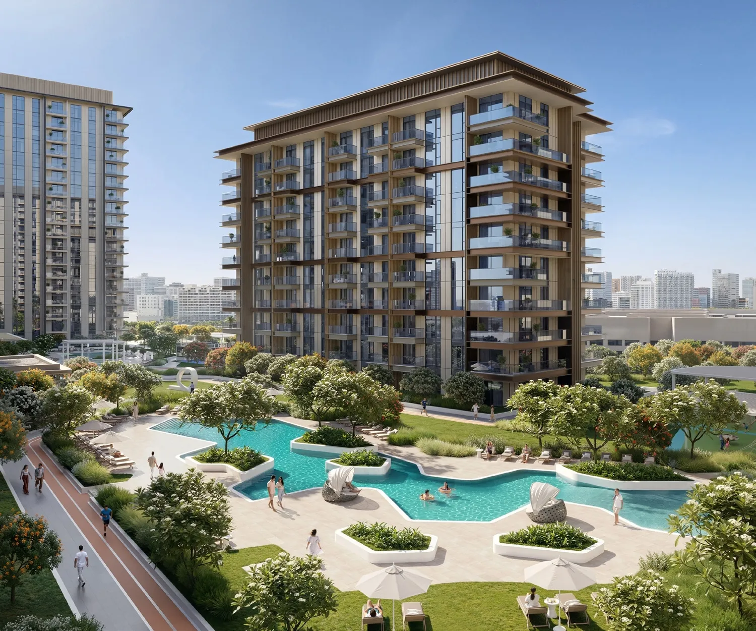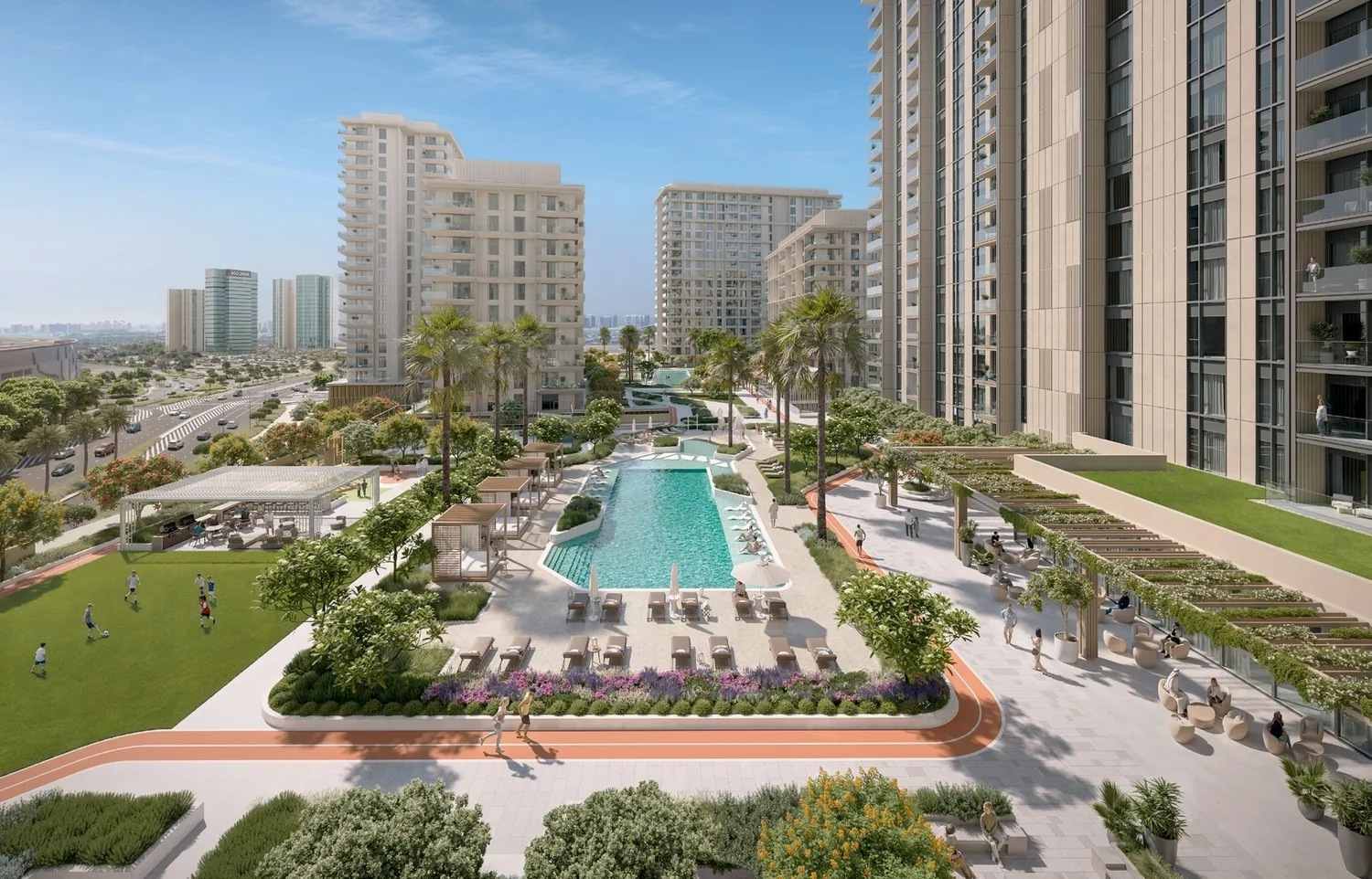 Tara Park is a contemporary residential development by Modon located on Reem Island in Abu Dhabi, designed to create a balanced lifestyle where urban convenience meets a calm, community-oriented environment. The first phase features two residential towers offering thoughtfully planned apartments surrounded by landscaped greenery and open public spaces. Positioned directly opposite Reem Mall and close to key destinations such as Al Fay Park, Sorbonne University, and major business districts, the project combines accessibility with a sense of tranquillity and everyday comfort. The development is conceived as a connected neighbourhood where pathways, gardens, and shared spaces encourage interaction and a relaxed pace of life. Residents benefit from a wide range of lifestyle-oriented facilities designed to support both activity and relaxation. The community includes a central swimming pool and a dedicated kids’ pool, alongside a fully equipped fitness studio for daily wellness. Outdoor amenities feature landscaped gardens, shaded walkways, open lawns, and a jogging track, creating inviting environments for recreation and social gatherings. Additional facilities include a padel court, multi-purpose sports court, adventure playground, BBQ areas, co-working and study zones, indoor kids’ play spaces, and residents’ lounges. A retail plaza, nursery, and a connecting bridge to Reem Mall further enhance convenience and integrate the development with the surrounding urban fabric. The residences are designed with contemporary interiors that emphasize comfort, practicality, and natural light. Living spaces feature modern finishes and carefully planned layouts that maximize openness and functionality. Kitchens are integrated with sleek cabinetry and dedicated dining areas, creating a seamless connection between cooking and living spaces. Bathrooms are finished in a clean, modern style with refined surfaces, while bedrooms include well-organized layouts with walk-in closets in selected units. Throughout the apartments, the interior palette combines contemporary materials with warm tones to create a calm and welcoming residential atmosphere.