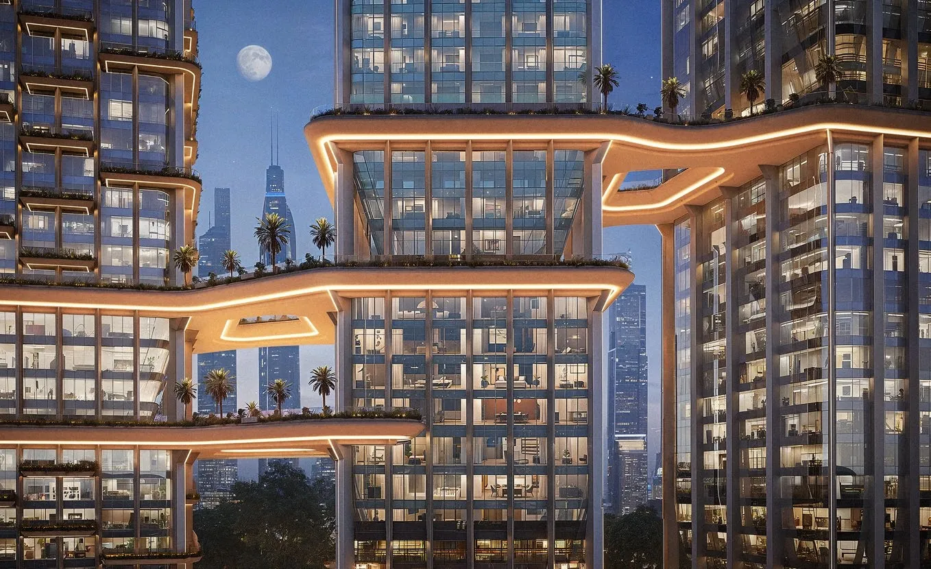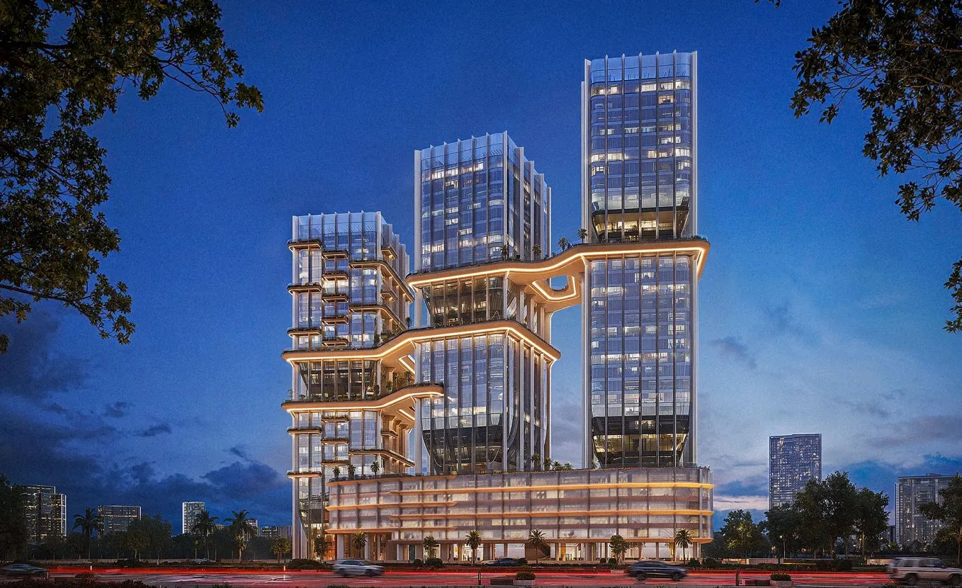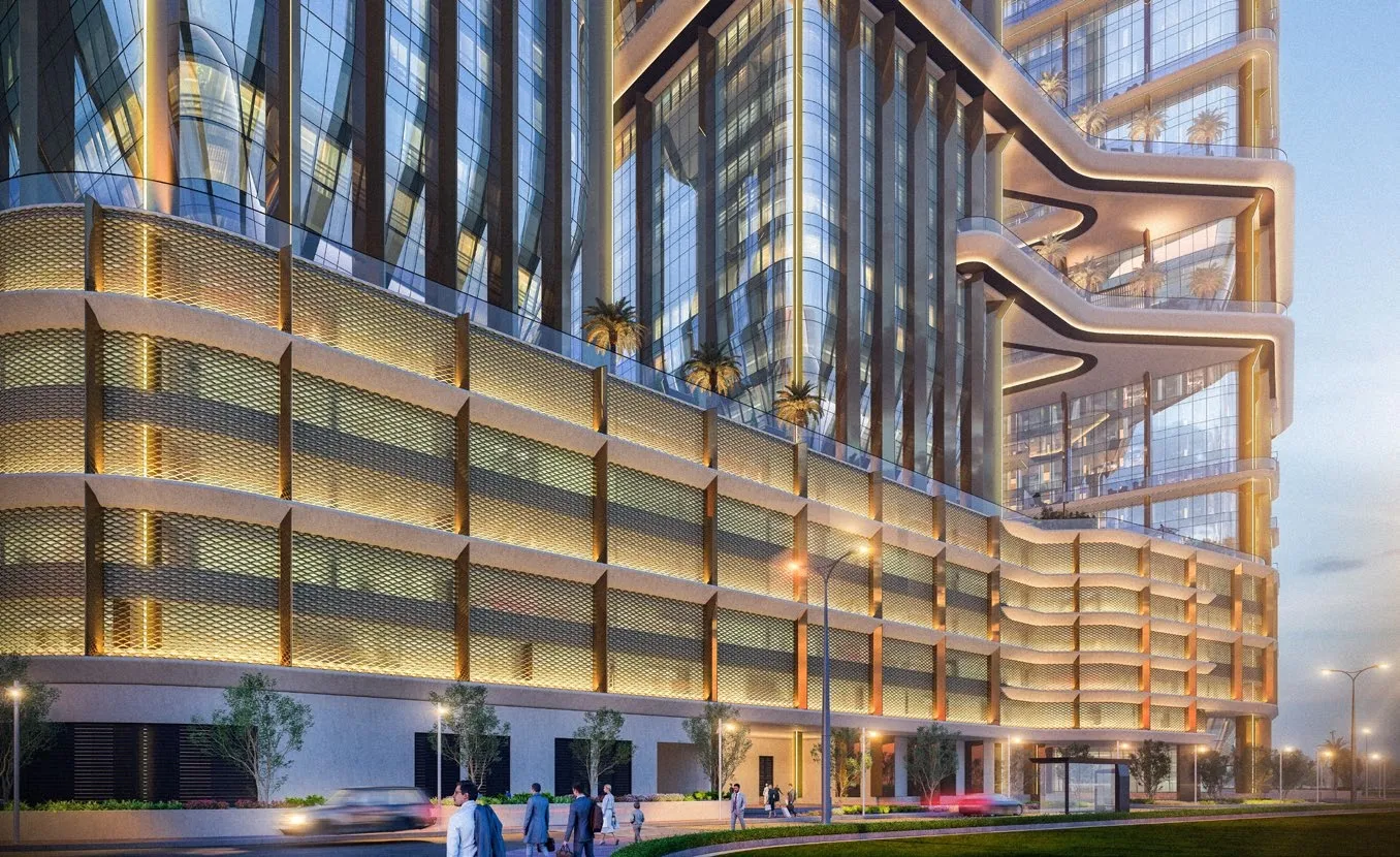 Radiant Bridges is a contemporary mixed-use development by Radiant Real Estate. The project brings together residential, commercial, and retail components within a unified architectural concept, featuring two Grade-A office towers and one residential tower connected through an integrated podium. Designed to create a seamless balance between work, life, and community, the development offers canal and city views while emphasizing connectivity and modern urban living. The development is complemented by a well-curated selection of amenities aimed at enhancing everyday convenience and lifestyle quality. Residents and professionals benefit from landscaped podium terraces, swimming pools, and fully equipped fitness centers, alongside dedicated lobbies for both residential and office spaces. Additional features include EV charging infrastructure, ample parking across podium and basement levels, and integrated retail and dining outlets at ground and podium levels, creating a vibrant and functional social environment. Interiors are designed with a focus on modern comfort and refined aesthetics, incorporating premium finishes and practical layouts. Apartments feature elegant flooring, designer fixtures, and floor-to-ceiling glazing that maximizes natural light and views. Kitchens are equipped with built-in appliances, including a fridge, oven, and integrated washer, complemented by premium fittings and modern lighting. The overall design emphasizes functionality and sophistication, with spacious wardrobes and thoughtfully planned layouts that enhance both comfort and usability.